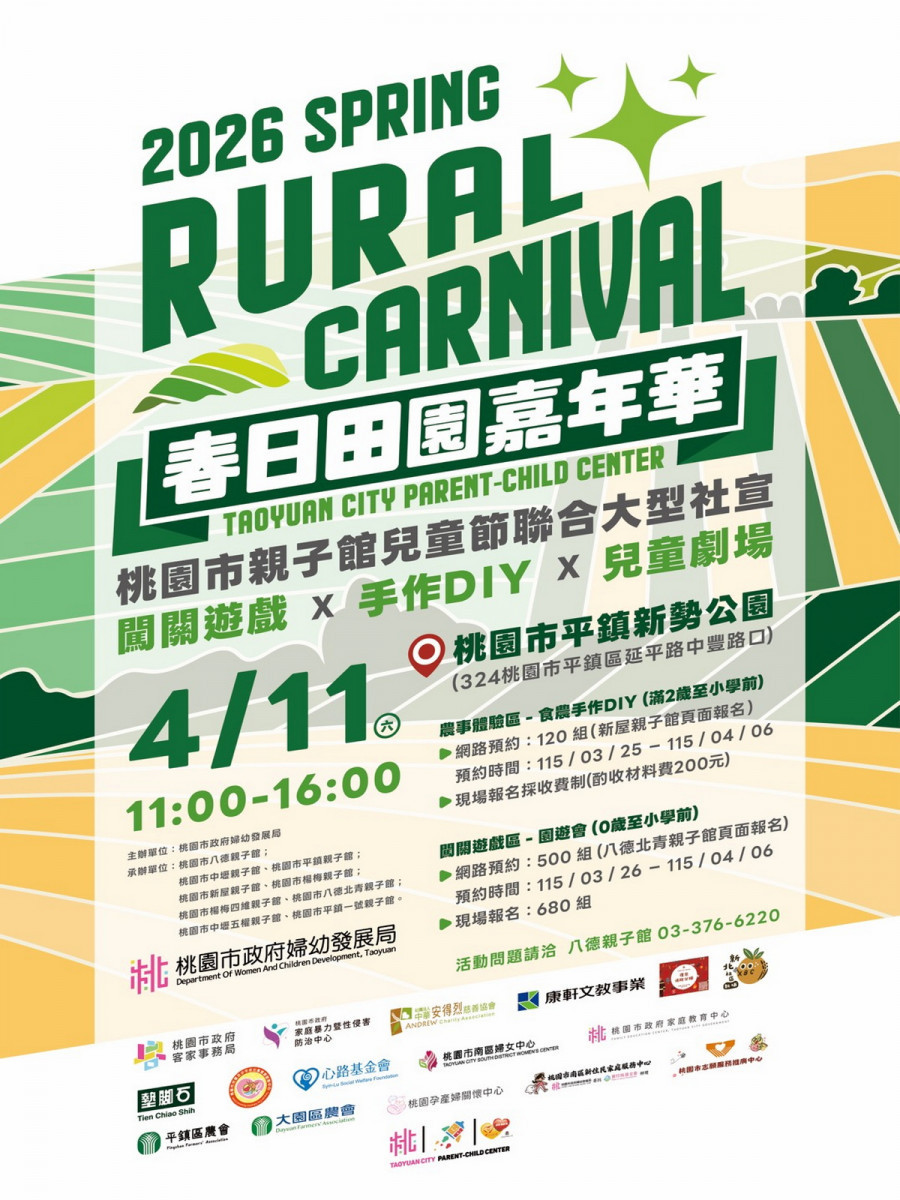 桃園4月兒童月熱鬧登場!為讓親子共度溫馨又歡樂的時光,桃園市25處親子館及復興親子車,精心推出各具特色的親子活動與闖關體驗遊程,內容精彩多樣,讓0至6歲幼兒及家長都能就近參與、盡情同樂。誠摯...