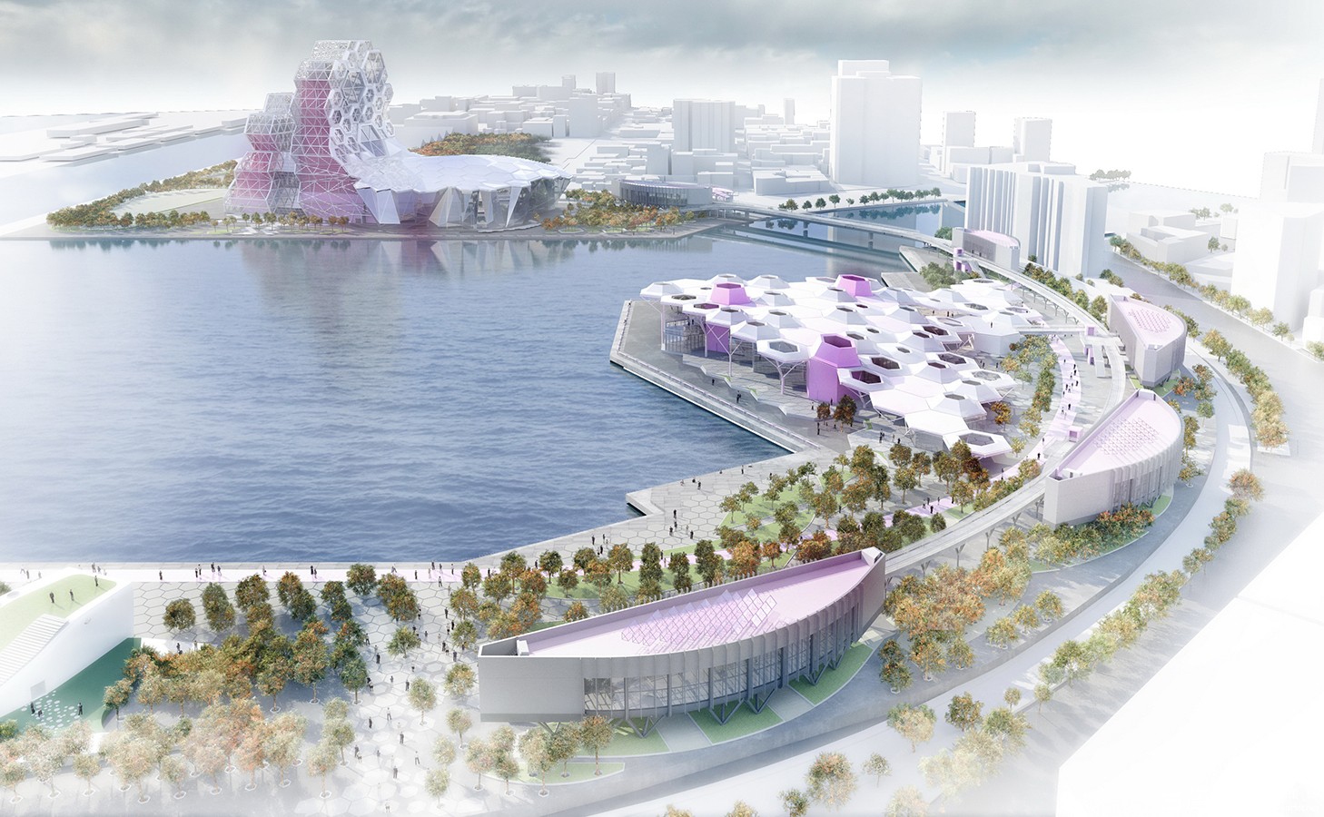新工處指出,該工程因配合輕軌捷運工程採二階段發包,第一階段工程位於高雄港13-15號碼頭區域,基地面積約3公頃,將興建6座小型表演廳,預定105年2月完工;第二階段工程位於高雄港11-12號碼頭及光榮碼頭區域,基地面積約8公頃,內容聚焦於主體建築工程及水岸景觀的建置,包含大型室內表演廳、戶外表演場、流行音樂展示區及產業社群空間、海洋文化展示中心及整體水岸環境景觀;建築體為地下1層、地上11層鋼骨構造(SC),建築高度約12至68公尺不等,總樓地板面積約5萬8千平方公尺;主表演廳、產業社群塔樓及海洋文化展示中心的外觀分別源自海浪及珊瑚等海洋意象,將營造新一代的海洋城市景觀。未來搭配水岸輕軌通車及已經完成的高雄展覽館、圖書總管、港埠旅運中心等建設,將串連並型塑完整的亞洲新灣區生活圈。