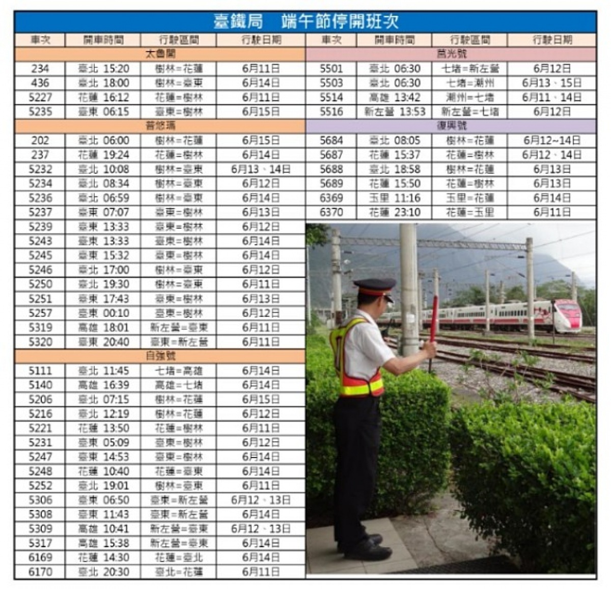 台鐵表示,依據中央流行疫情指揮中心110年5月11日公布事項及交通部110年5月14日交路字第11050060721號公告,因應疫情發展,5月15日至6月14日台鐵局各級對號列車(太魯閣號、普悠瑪號、自強號、莒光號及復興號)禁止站票(無座)搭乘,持用定期票或悠遊卡、一卡通等電子票證旅客,請搭乘區間車或區間快車,站票(無座)搭乘對號列車,台鐵局將予勸導請其下車,勸導不聽者,將移送鐵警局交地方衛生單位裁罰。