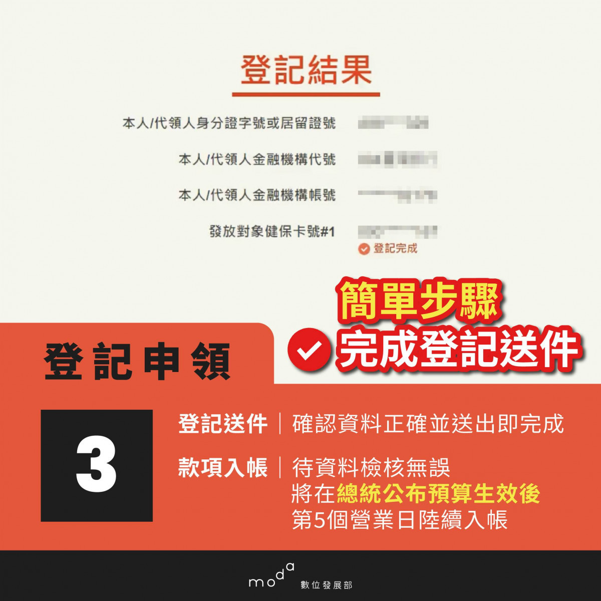數位部說明,登記入帳原則由本人登記,父母或法定代理人可為12歲(含)以下的未成年子女代領。登記步驟如下: