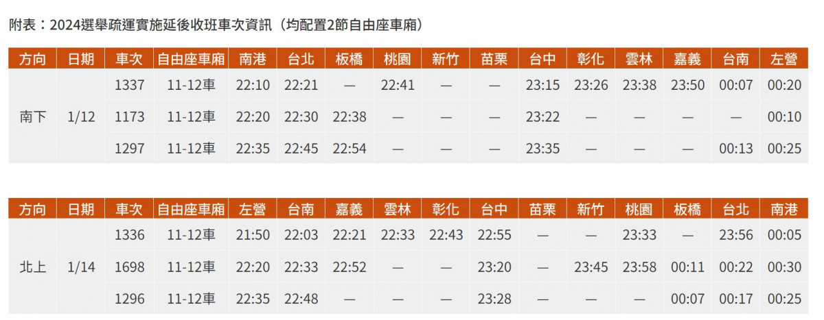 台灣高鐵指出,為加強服務返鄉投票的旅客,分別於1月12日投票日前,以及1月14日收假日,各提供3班延收車次,此6車次僅提供2節(11-12節)作為自由座車廂,歡迎旅客多加利用並及早訂位。