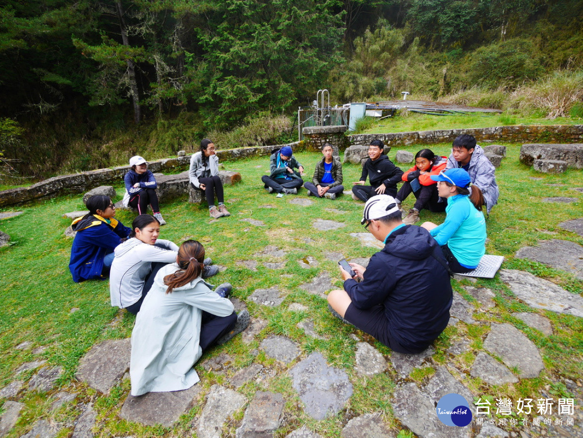 嚮導與學員在排雲登山服務中心前席地而坐進行營隊課程。(玉管處提供)