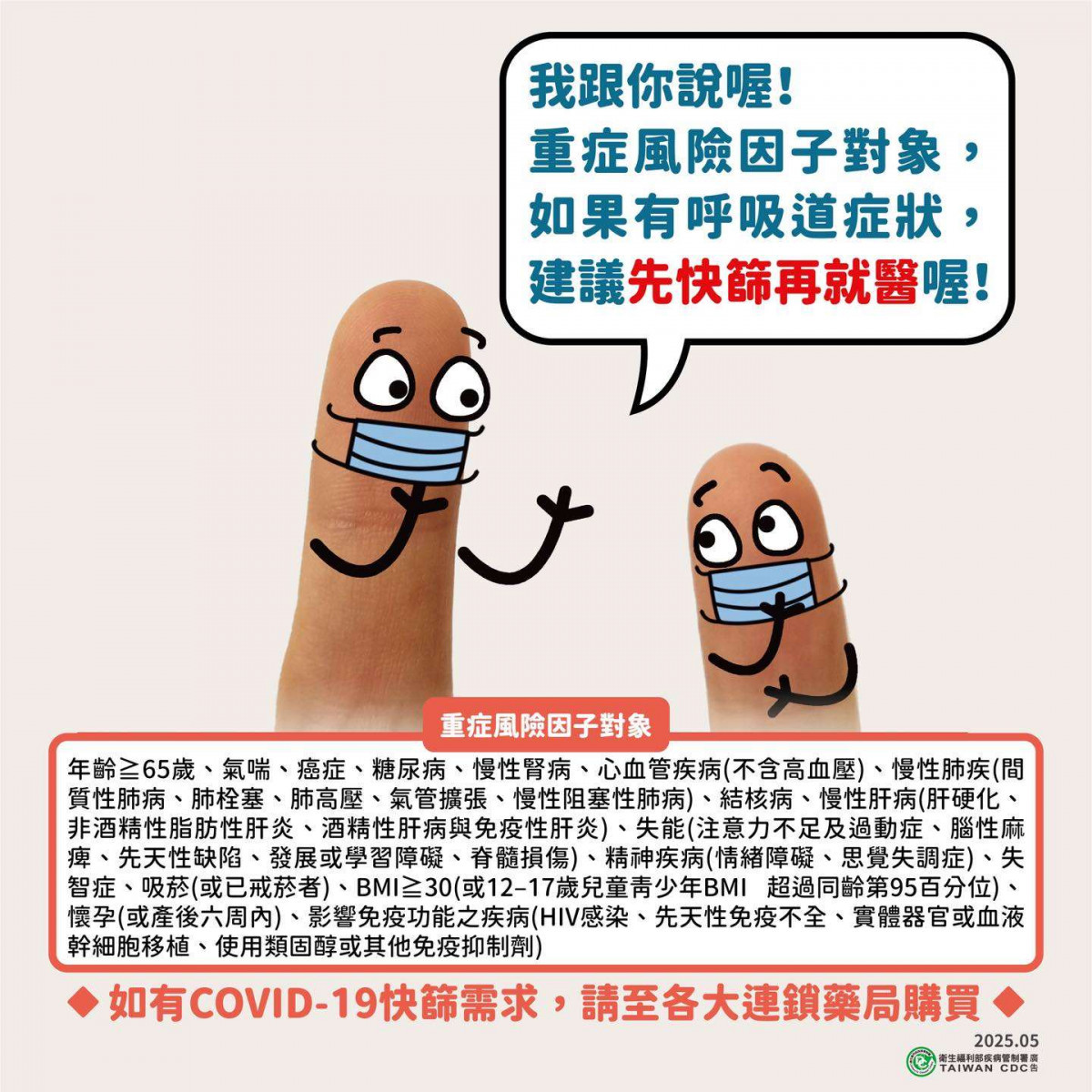 雲林縣衞生局長曾春美表示,因應新冠疫情升溫,呼籲民眾出入醫院、搭乘大眾運輸工具、進出人多的公共場合及至長照機構探訪應配戴口罩。而高風險族群為年長者、具有慢性病史者,如果出現咳嗽、流鼻水、鼻塞、喉嚨痛等呼吸道症狀,建議先戴口罩儘速就醫,由醫師評估是否需進行呼吸道傳染病相關篩檢,及進行後續診斷與治療,服用抗病毒藥物,降低重症住院風險。