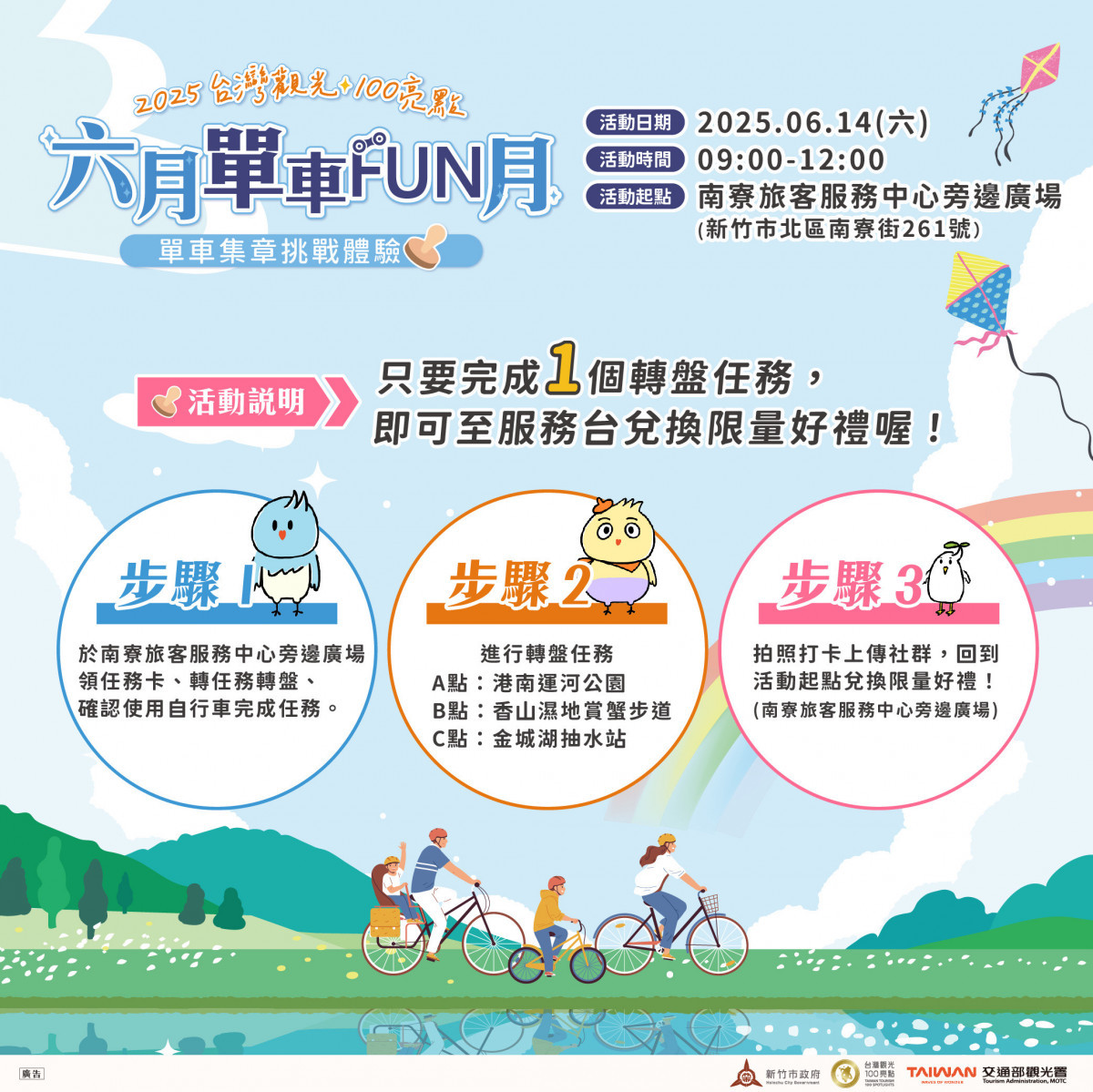 新竹漁港入選台灣觀光100亮點!新竹市政府將於6月14日9時至12時,在新竹漁港辦理「六月單車FUN月×南寮任務闖關」。城銷處表示,此次活動結合響應世界自行車日單車騎乘與任務挑戰,邀請市民與旅客從新竹漁港出發,沿著十七公里自行車道探索沿線的海岸風光與生態景點,透過趣味闖關與限量好禮兌換,打造兼具健康與永續概念的城市旅遊體驗。
