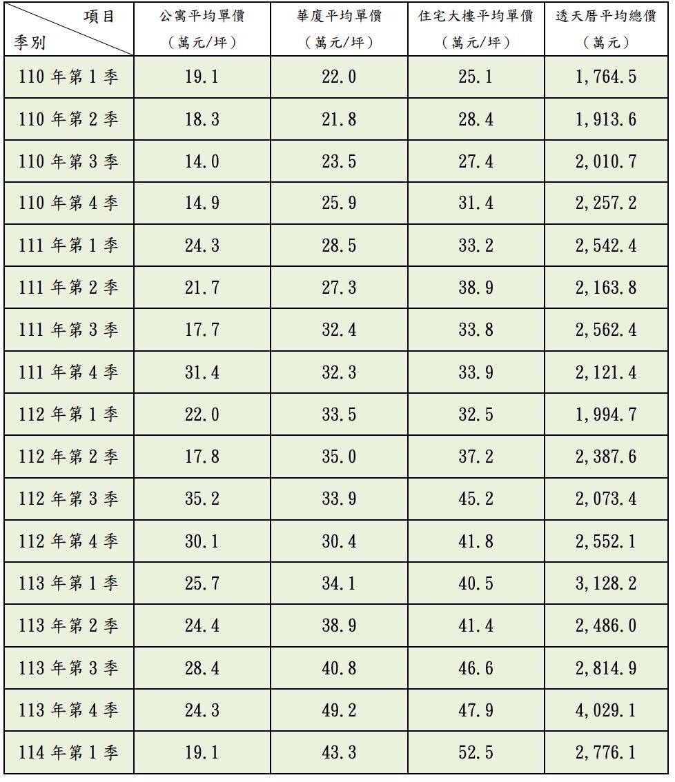 值得注意的是,今年第一季竹北的住宅大樓平均單價,持續創新高,由去年第四季的每坪均價47.9萬元,漲至52.5萬元,短短四年,住宅大樓平均單價就由2021年第一季的25.1萬元,攀升至如今的5字頭單價。
