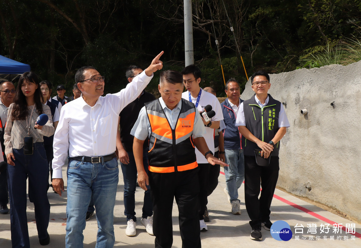 侯友宜表示,去年10月山陀兒颱風帶來豪大雨,導致雙溪區區道北38線4K+500~6K+000區間邊坡道路土石坍落,崩塌範圍長180公尺、高200公尺,不僅中斷道路,更危及道路下方住戶安全。在地質與天候條件不佳的情況下,市府施工團隊仍於今年6月完成第一階段的復建工程,特別肯定團隊的努力,讓地方居民與用路人能重獲安全順暢的通行環境。
