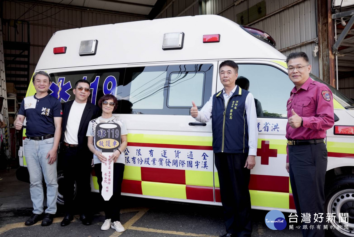 為發揚大愛無私奉獻精神,提升新北市緊急救護品質,漢宇國際開發實業公司、全通貨運公司與洪省女士等,今(3)日共同捐贈新北市政府消防局第三救災救護大隊龍源分隊高頂救護車1輛。內部配備救護器材含履帶式搬運椅、CPR大人電極貼片、快速應變救護背包、戰術防護背包及出血控制戰傷包,除即時提供救護人員一臂之力,更強化救護人員外傷處置及緊急救援能力。