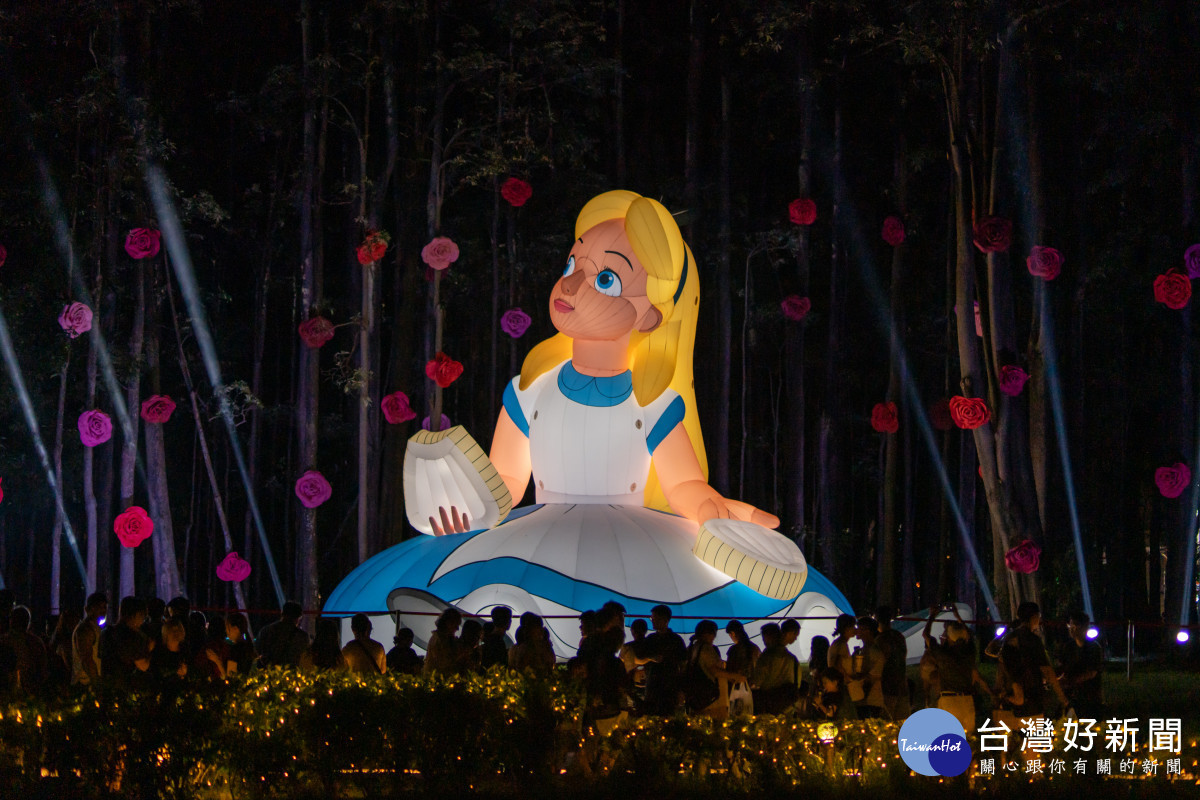 2025嘉義市光織影舞昨(4)日在北香湖公園璀璨登場,今年以「光影夢境」為主題,結合迪士尼經典動畫《愛麗絲夢遊仙境》,打造8大沉浸式展區。開幕首日,北香湖公園熱鬧非凡,遊客宛如置身光影魔法世界,每個角落都成為拍照打卡的熱門景點。現場不僅有亞洲知名幻術師與重量級歌手輪番演出,更有9米高愛麗絲造型立體裝置和北香湖上4.5米高旋轉月亮裝置點綴夜空,將整個場景打造得夢幻迷人、充滿奇幻魅力。