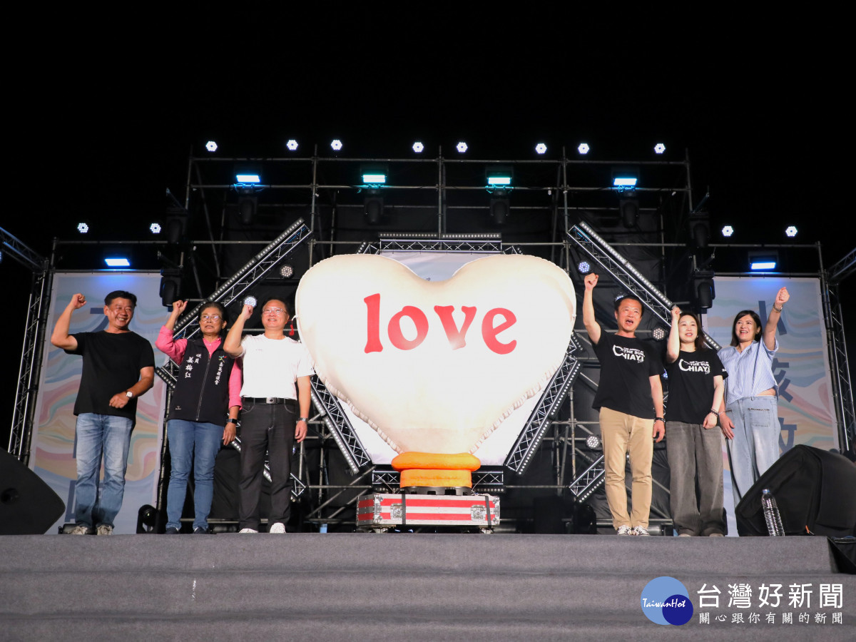 嘉義縣年度盛事「2025東石海之夏」於中秋連假登場,縣長翁章梁帶領現場觀眾點亮愛心燈,為災區送上關懷與祝福/嘉義縣府提供