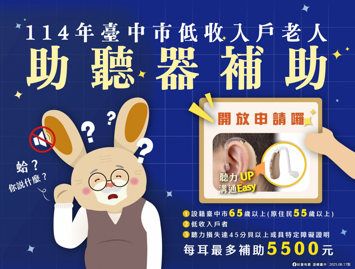 為協助經濟弱勢長輩改善聽力退化造成的溝通障礙,臺中市政府社會局自114年8月17日公告開辦「低收入戶老人補助配戴助聽器實施計畫」,針對設籍臺中市年滿65歲(原住民55歲)以上有聽力損失的低收入戶長者,最高每只助聽器補助新臺幣5,500元。