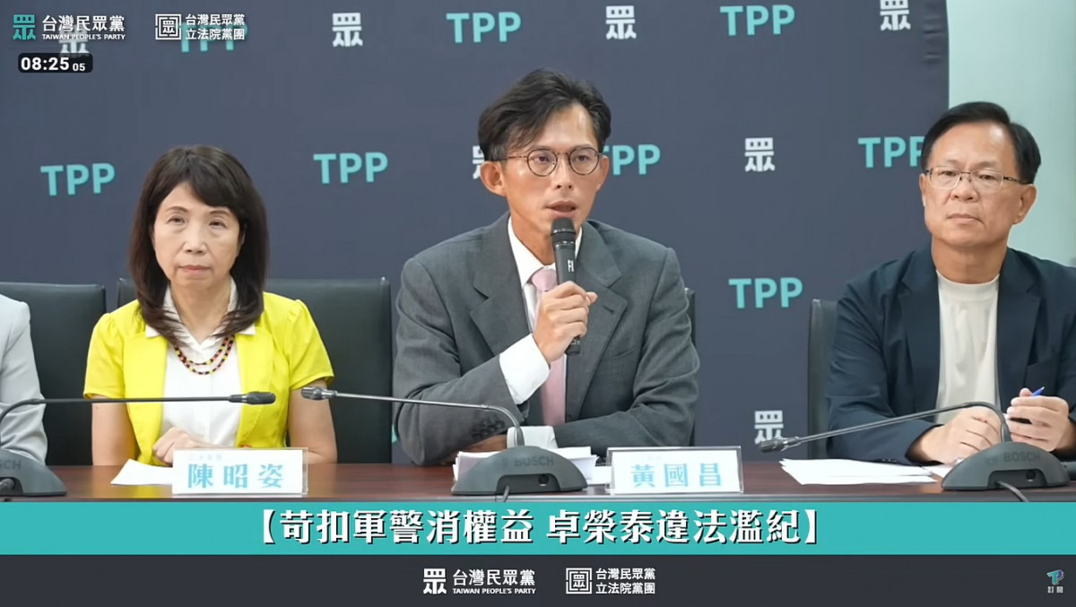 黃國昌表示,民眾黨團晨會今天有兩個決議向外界報告,首先是將對總預算案提出復議,因為行政院態度依然傲慢、自己扮演太上皇,完全不把軍警消權益放在心裡。不論是《軍人待遇條例》還是《警察人員人事條例》,都是立院三讀生效、總統公告,行政院說不編就是不編,行政院長卓榮泰違法濫權作為,令人無法接受。