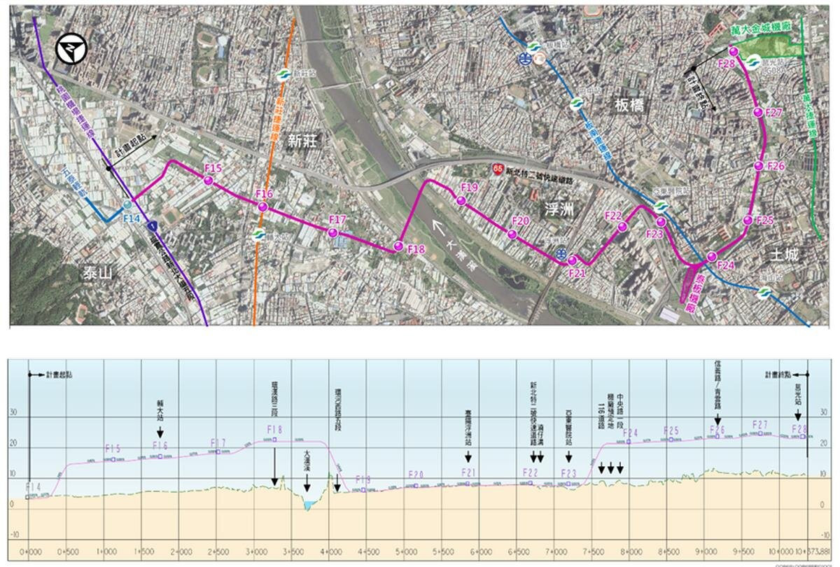 侯友宜指出,泰板輕軌規劃長度10.3公里、共14座車站,路線連接泰山、新莊、板橋、土城、中和地區,原先規劃F18及F24這2座高架車站、長2.5公里,為配合中央,決定將既有的2處高架段延長,增加7個高架車站,調整後高架段總長7.3公里、共有9座高架車站,分別為F15~F18站及F24~F28站,經估算全程行車時間可縮短11分鐘,以提升旅客搭乘意願及運量。