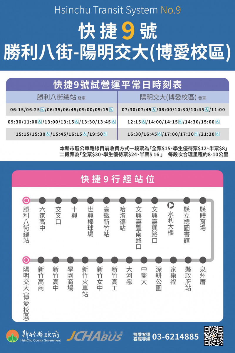交旅處說明,第四階段於114年11月3日上線後,快捷9號每日班次由原25班次增加至33班次(往程16班次、返程17班次),其中往程(往陽明交大博愛校區方向)增加6:25、09:15、13:15、 15:30等班次,返程(往勝利八街總站方向)增加07:45、10:45、14:15、 16:45等班次,無障礙車輛班次也由8班增為16 班次。