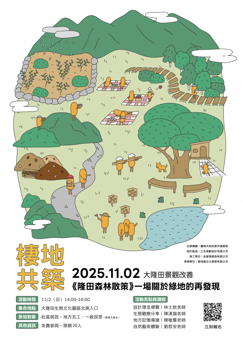 兩條導覽路線將在「社區之森」(園區東北角)交會並互換講師,進行另一場體驗,讓所有參加者都能完整感受自然與人文的雙重魅力。大隆田生態文化園區不僅是官田的重要綠地,更是市府推動軟硬體並進、永續營造的典範。活動報名連結: https://forms.gle/8UTeXWUJh9R44UHo7名額有限,額滿為止。