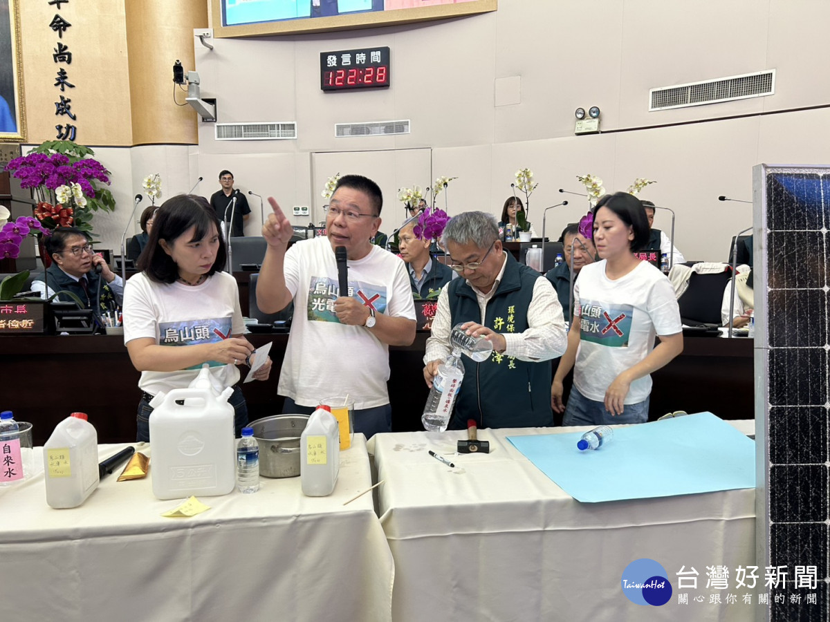 台南市議員蔡育輝、蔡淑惠、李中岑23日聯合總質詢,拿著一片光電板,進行烏山頭水庫實驗秀2.0版,表達堅決反對烏山頭水庫設立太陽光電板的立場。他們強調,台南種電面積全國第一,光七股就3500多公頃,還差烏山頭水庫的11.5公頃?