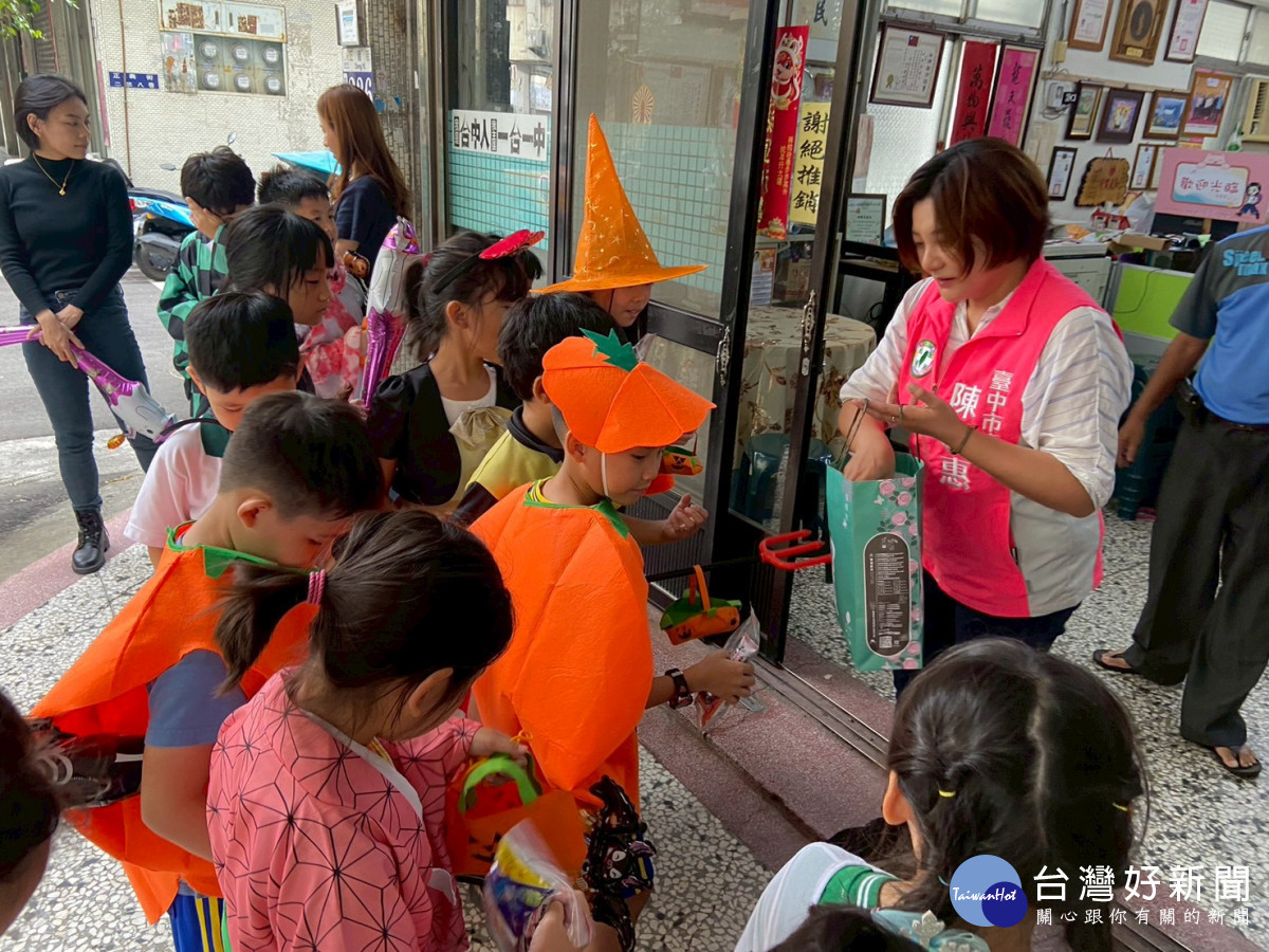 不給糖就搗蛋!迎接萬聖節,台中市南區木木好日安親班小朋友27日下午在老師帶領下,穿著各式各樣的創意服裝上街討糖,市議員陳雅惠服務處人員也和小朋友同樂,分送糖果,氣氛熱鬧。