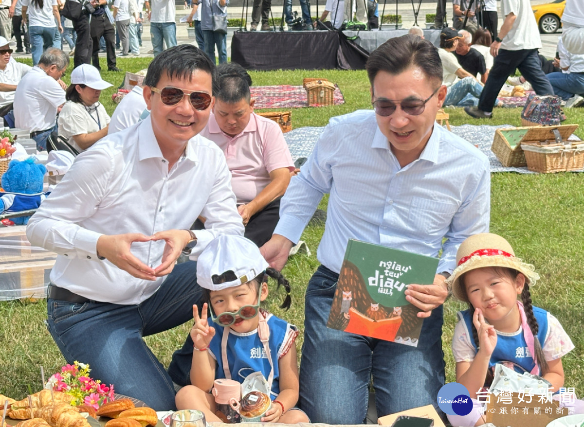 台中市客委會主委江俊龍(左)參加2025臺中市民野餐日記者會,推薦貓頭鳥繪本。