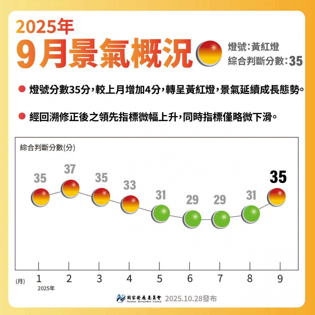 國發會今日發布9月景氣對策信號,綜合判斷分數為35分,較8月上修值31分增加4分,燈號由綠燈轉呈黃紅燈;其中,AI需求熱絡帶動相關供應鏈外銷動能,致批發、零售及餐飲業營業額轉呈黃紅燈、製造業銷售量指數轉呈紅燈,股價指數則因台股走高,轉為黃紅燈。另經回溯修正後之領先指標微幅上升,同時指標僅略微下滑,顯示景氣仍延續成長態勢。