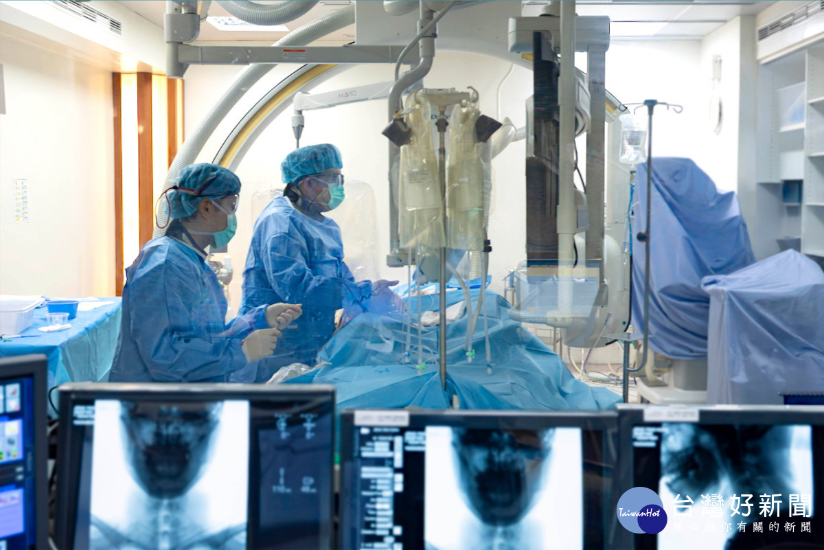 彰基取栓團隊正在導管室中執行緊急手術,與時間賽跑搶救急性腦出血患者,力求迅速取栓,提升病人康復機會。圖/彰基醫院提供
