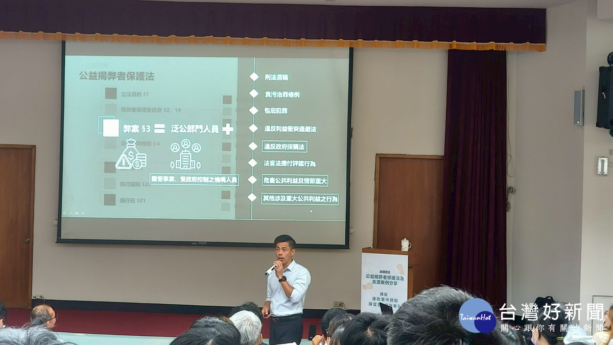 此次課程邀請法務部廉政署中調組廉政專員陳富豐擔任講師,以「公益揭弊保護法及貪瀆案例分享」為題,深入解析該法的立法目的、揭弊程序及權益保障,並以實際案例說明同仁在執行業務時應注意的風險與責任。陳富豐指出,揭弊制度不僅保障個人,更是健全社會廉能體制的重要基石,期勉與會人員在工作中能以依法行政為核心,避免誤觸法網。
