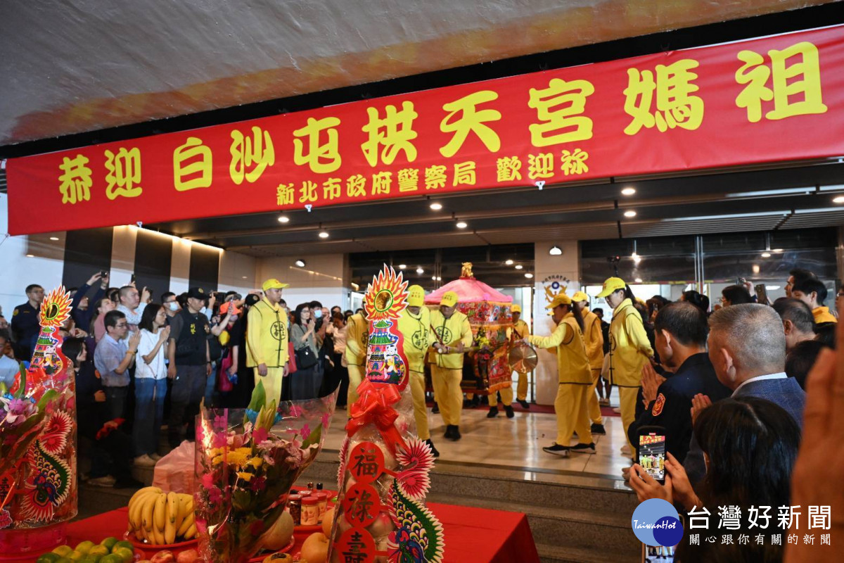 有「粉紅超跑」美譽的苗栗通霄白沙屯拱天宮媽祖,1日下午5時33分停駕新北市政府警察局。大批信眾齊聲高喊「進喔!」,氣氛熱烈。媽祖神轎短暫停駕警局,由局長方仰寧率領同仁恭敬參拜,祈求新北治安平穩、交通順暢、民眾安居樂業。