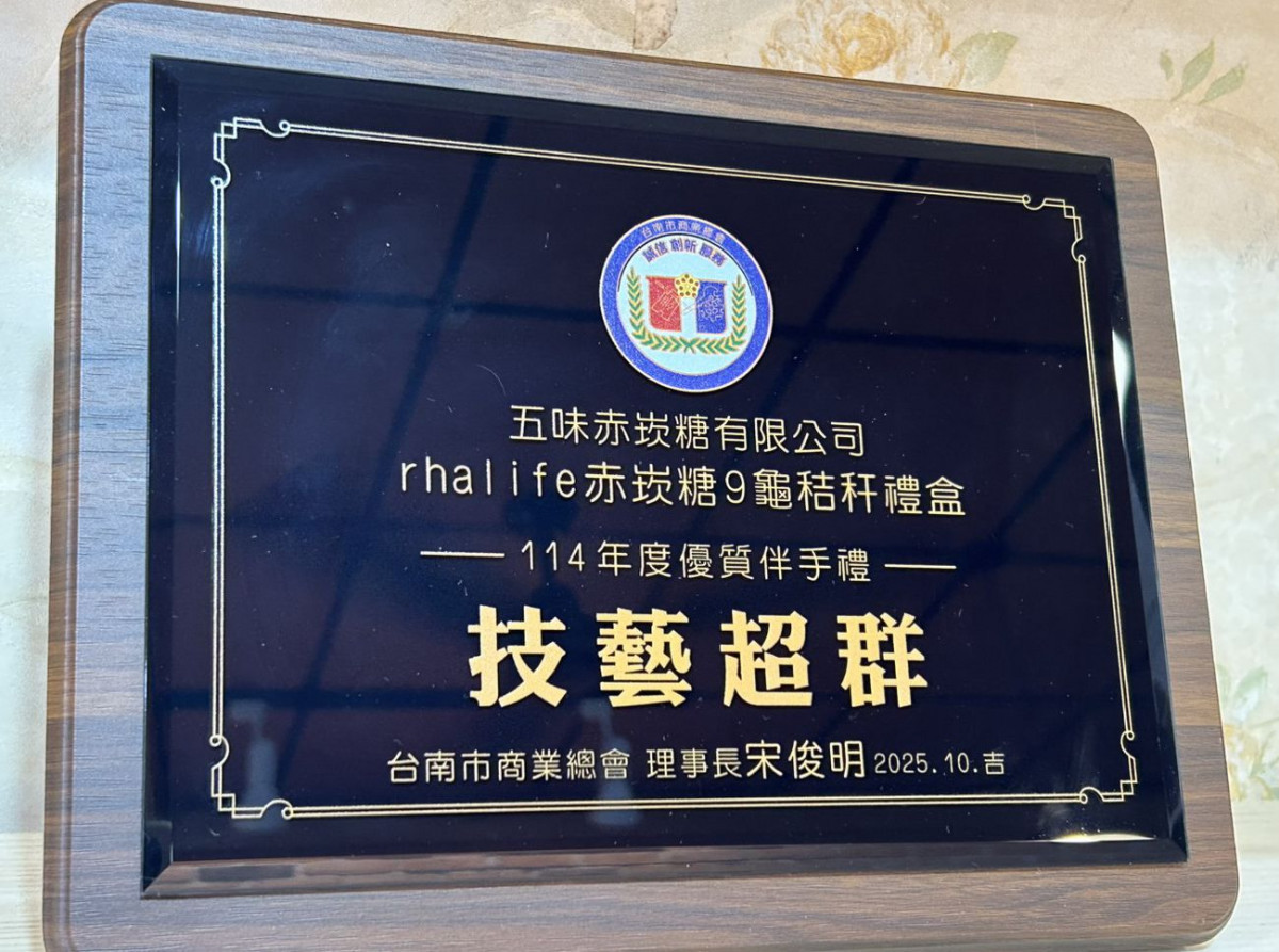 rhalife赤崁糖吳易隆總監代表五味赤崁糖限公司上台領獎,剛從「大阪世界博覽會-伴手禮專門店」補貨回台的吳易隆表示,繼「台灣百大糕餅伴手禮-赤崁樓九龜(九贔屭)鳳梨酥」、「台南好禮-N61赤崁糖手工盒」、「禮好台南-薑茶分享盒」、「禮好台南(入圍)-赤崁樓九龜鳳梨酥」、「台南市好人好事代表」,本次「赤崁樓九龜秸秆禮盒」再獲「114年度優質伴手禮-技藝超群」,是 rhalife赤崁糖2025年第5度獲獎,也是「赤崁樓九龜(九贔屭)鳳梨酥」第3度獲獎。