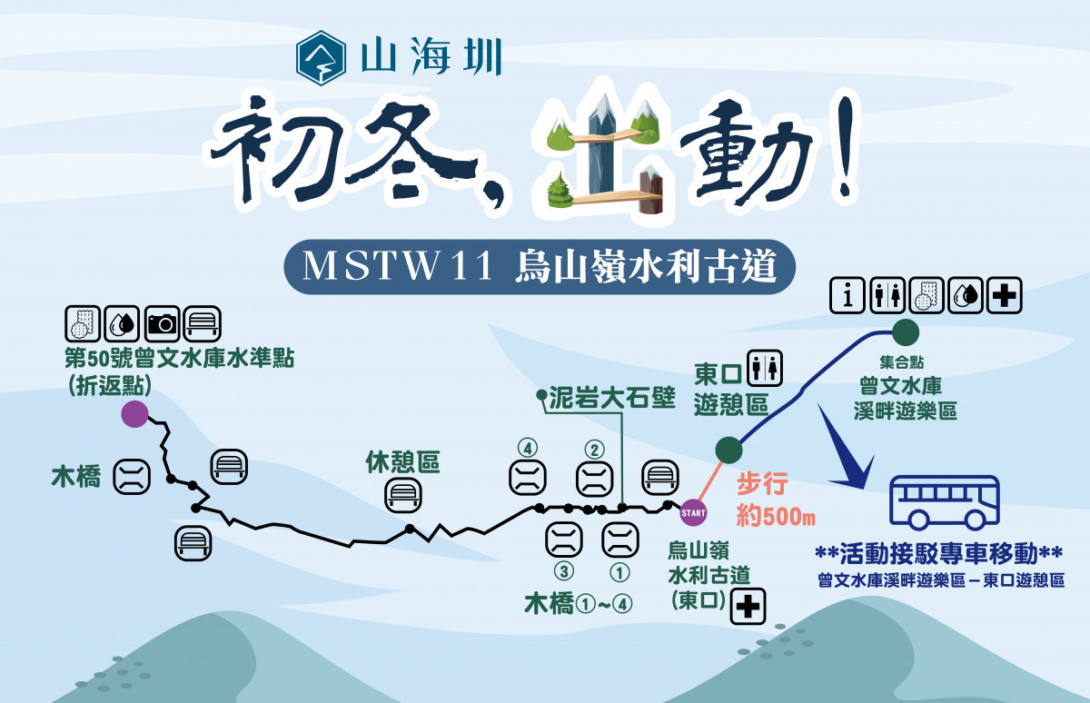 農業局表示,活動地點位於楠西區的山海圳國家綠道MSTW11路段的烏山嶺水利古道。活動分4梯次舉行,報到地點在曾文水庫溪畔遊樂區,提供善化火車站至會場的接駁服務,歡迎民眾踴躍報名參加,相關活動資訊請上「山海圳任我行」粉絲專頁https://www.facebook.com/share/1GfHUA25bj/?mibextid=wwXIfr。查詢。