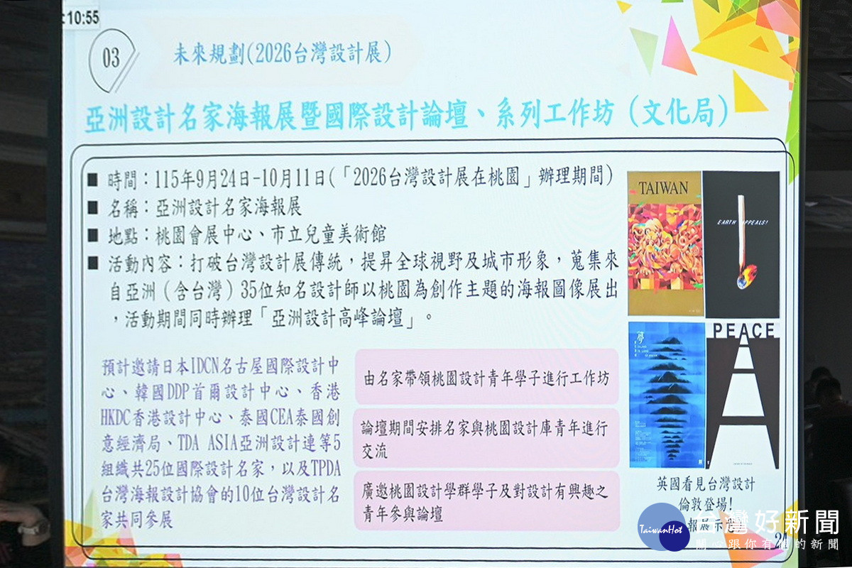 文化局指出,配合本市辦理「2026台灣設計展」,市府前瞻布局進行3場國際設計交流行動,邀請國際設計大師及設計組織來台進行對話及意見交換,擴大未來國際合作網絡,提升桃園的國際能見度,實踐推動桃園成為亞洲設計中心願景。於2026台灣設計展期間,也將透過「亞洲設計名家海報展暨國際設計論壇」及系列工作坊,廣邀國內外知名設計師共同創作交流,提升城市形象與全球視野。
