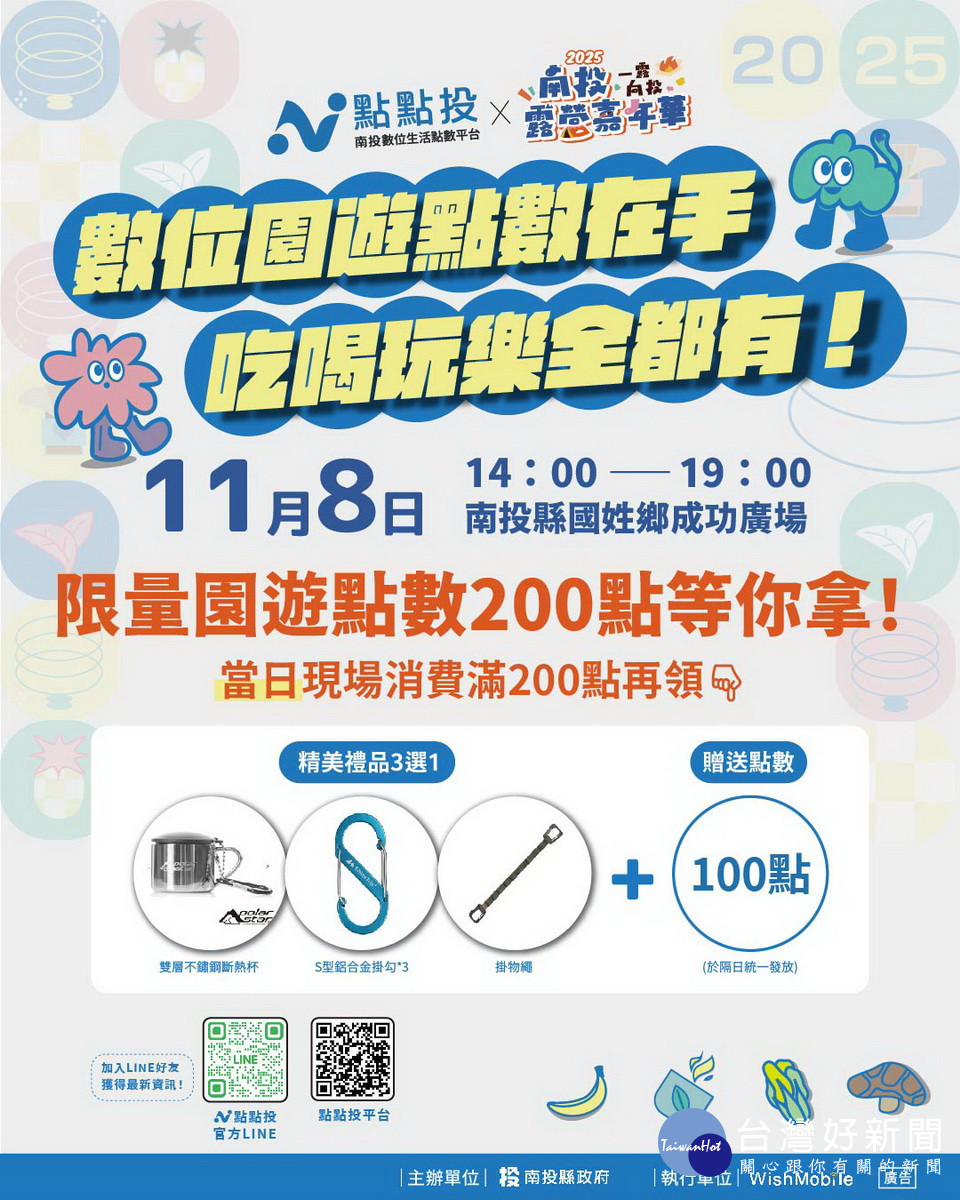 活動當天民眾只要掃描現場報到QR Code,加入「點點投 LINE 官方帳號」完成註冊,於現場即可獲得200點數位點數,可於現場29個合作攤位直接折抵使用。凡當日點數消費達200點以上,還能再獲得加碼100點回饋及禮品兌換券,讓參與者「邊玩邊賺回饋」,享受更超值的消費體驗。限量贈品包含雙層不鏽鋼斷熱杯、S型鋁合金掛勾與登山掛物繩等實用露營小物,數量有限,送完為止!