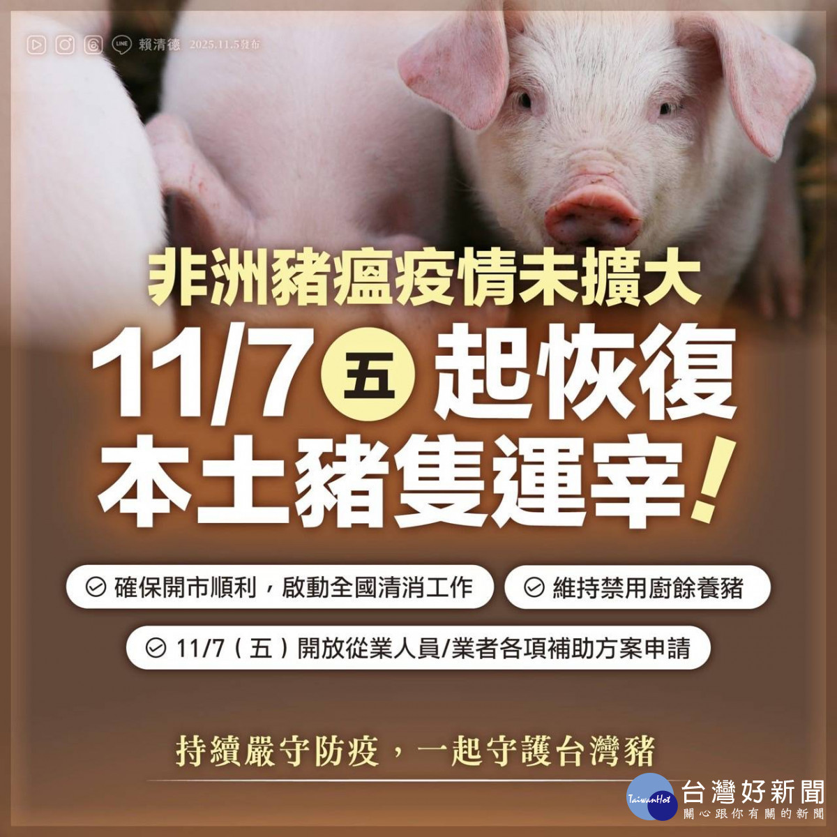 非洲豬瘟未再出現新案例 肉品市場11/7恢復豬隻拍賣與屠宰