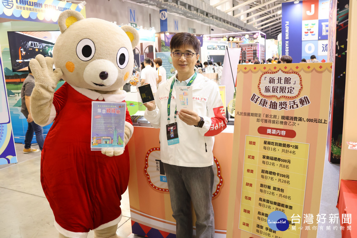 2025 ITF台北國際旅展今(7)日於台北南港展覽館盛大開幕,新北市政府觀光旅遊局以「漾.新北」為主題,吉祥物「小客」現身與粉絲合照,互動玩遊戲,送好禮,吸引大批民眾湧入新北館。新北館更與基隆館、台北館、桃園館推出疊色印章集章活動,凡於基北北桃四館不限金額消費,即可憑單據至該館服務台兌換空白明信片一張,再前往各館完成各館指定任務,就可至台北館服務台進行搖獎儀式,抽出基北北桃精選好禮。
