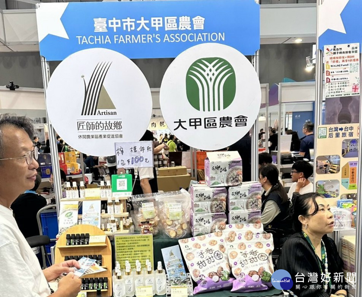 大甲區農會這次特別準備芋鄉米粉湯、芋香甜甜圈等超人氣產品至旅展販售,也藉機宣傳匠師的故鄉休閒農業區內各農場食農及永續體驗行程,甲桂林有機農園也準備了茶樹精油、純露等農遊伴手,經由旅展讓消費者認識大甲在地特色農遊資源及景點。