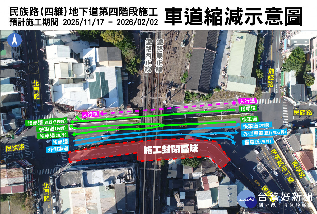 交通局表示,台鐵地下化工程中的民族路(四維)地下道將進行第四至第六階段施工,第四階段(工期90天)、第六階段(工期149天)施工期間分別佔用南、北兩側慢車道,並將車輛導引至內側車道,特別注意的是第五階段施工將佔用內側快車道進行施工,預計於115年2月春節年假後進行,工期約131天,為減低內側快車道封閉期間交通衝擊,將開放外側機慢車道給小型車通行,另為利車輛通行順暢,亦規劃改道動線並設置導引牌面疏導車流,建議用路人可依改道動線行駛,同時可收聽警廣掌握即時交通路況避開壅塞時段。