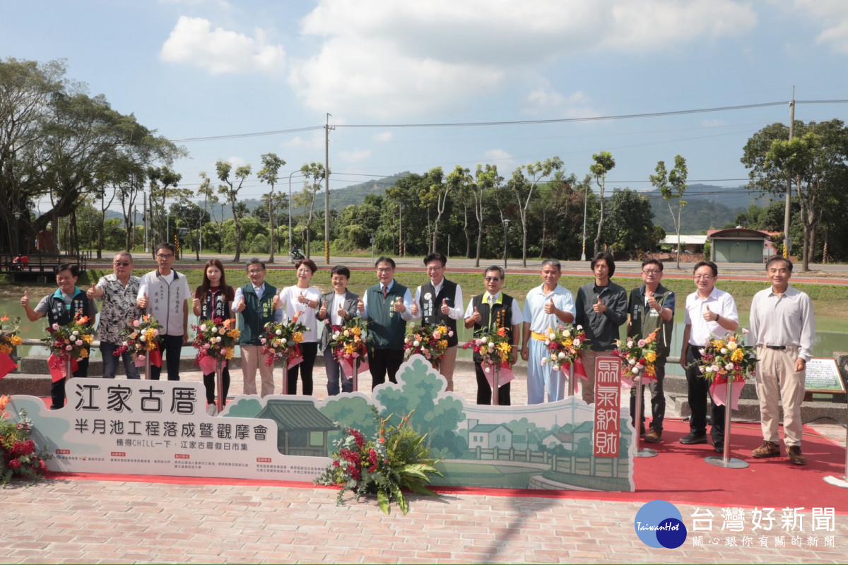 整治後的半月池重現鹿陶洋景致,市府15日舉辦「江家古厝半月池工程落成暨觀摩會」及「楠得CHILL一下‧江家古厝秋日市集」,邀請民眾走讀聚落故事,並順道選購在地商品,市長黃偉哲也親自到場為活動揭幕。