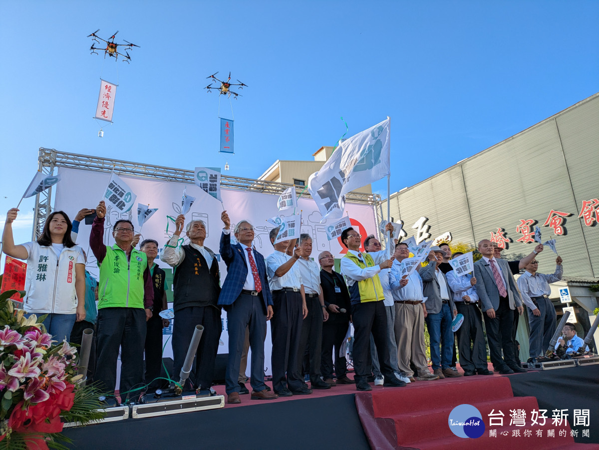 林世賢市長揮舞大旗無人機同時升空造勢。圖/記者鄧富珍翻攝