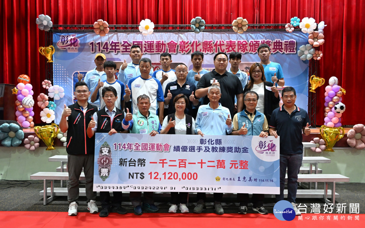 彰化縣代表隊在114年全國運動會表現亮眼,勇奪5金、14銀、17銅,共計36面獎牌,寫下近5屆以來最佳成績。縣長王惠美16日出席頒獎典禮,親頒1,212萬元獎助金給選手與教練團隊,感謝所有投入競技體育的人員,也勉勵選手持續突破自我,再為彰化爭取最高榮譽。
