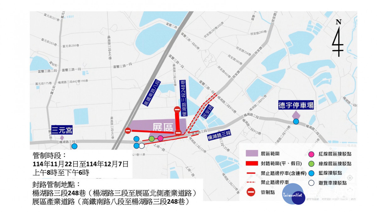 假日期間楊湖路三段248巷(楊湖路三段至展區北側產業道路)及展區產業道路(高鐵南路八段至楊湖路三段248巷)均採封閉管制,並管制大型車輛於楊湖路二段與泰圳路口改道行駛,於該路口左轉泰圳路再接上湖一路往台31線方向行駛;為避免造成車輛堵塞,楊梅警分局於各路口均有編排警(民)力於現場指揮引導,並請大型車輛駕駛配合指揮改道行駛。