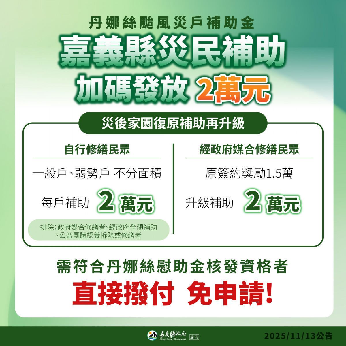 凡是原本符合「丹娜絲家園復原慰助金」資格的受災戶,縣府將不分房屋損壞面積大小,一律加發2萬元的「加速重整家園補助金」,以實質補貼這些靠自己力量恢復家園的民眾。值得注意的是,本次補助主要針對自行修繕戶,因此經政府媒合簽約修繕、或經政府及公益團體協助拆除或修繕的受災戶,非本次補助的適用對象。