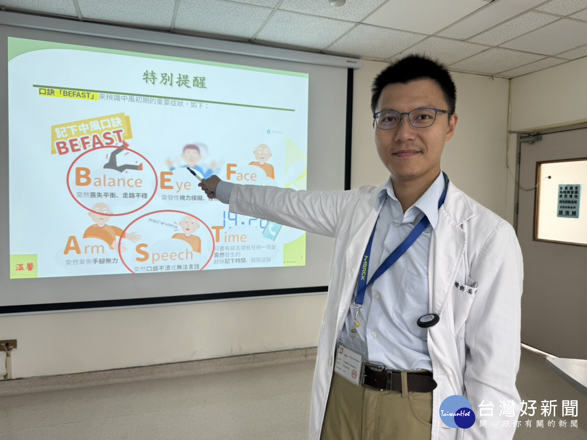 吳醫師也提出初期腦中風徵兆口訣「befast」,包括「belance突然失去平衡走路不穩」、「eye突發性視力模糊或複視」、「face突然臉歪嘴斜」、「arm突然單側手腳無力」、「speech突然口齒不清或無法言語」、「time出現上述五種症狀之一就記下發病時間,立即送醫並告知醫師」,目前血栓溶解劑黃金治療期為發病後4.5小時內,希望大家對中風有基本認識,可以及時送醫接受治療,避免遺憾。