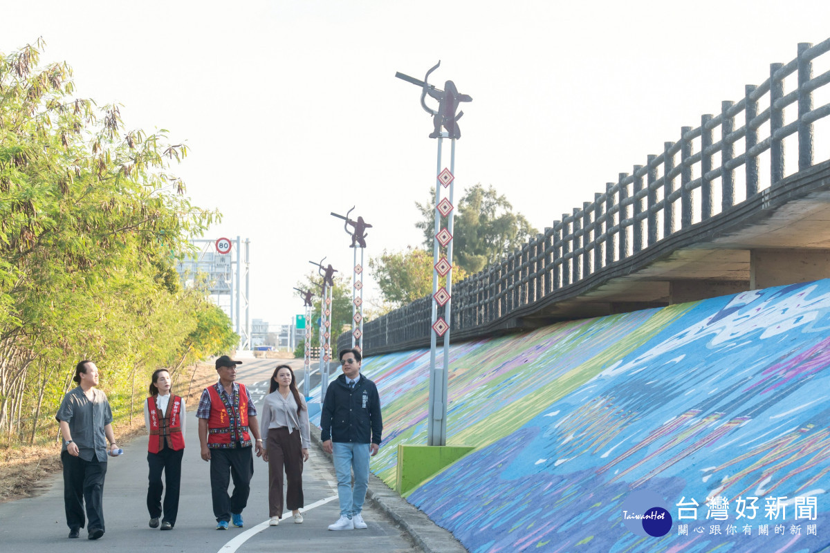代理市長邱臣遠偕同民政處長施淑婷及李金文頭目、林慈愛議員一起欣賞牆面之美。