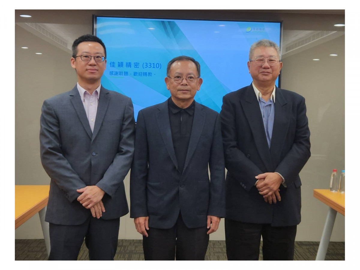 圖說:佳穎精密董事長董事長林坡圳(中)與總經理蔡東勲(左),及財務長陳樹根(右)於法說會後共同合影。
