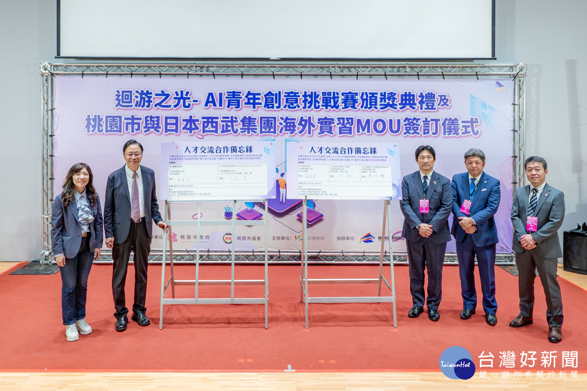 青年局表示,今年「洄游之光-AI青年創意挑戰賽」自7月開放報名以來,吸引逾百名青年參加。今日除了頒獎給在競賽上展現AI工具應用創意的優秀青年朋友們外,與西武集團的簽訂海外實習MOU,更是助力本市青年職涯發展的重要里程碑。期盼與日本西武集團旗下西武王子大飯店國際株式會社(SPW)及其子公司橫浜八景島株式會社的合作,開啟桃園青年赴日實習的新渠道,進一步拓展國際視野與競爭力,協助本市青年走向世界。包括市府青年局長侯佳齡、勞動局主任秘書洪清淵、桃園市立圖書館長施照輝、桃園市就業職訓服務處副處長陳慧茹、桃園區公所主任秘書周政毅、西武王子大飯店人力資本部長大森篤、株式会社横浜八景島執行董事手嶋一雄及台灣橫浜八景島股份有限公司董事長荒川潤等均一同出席。