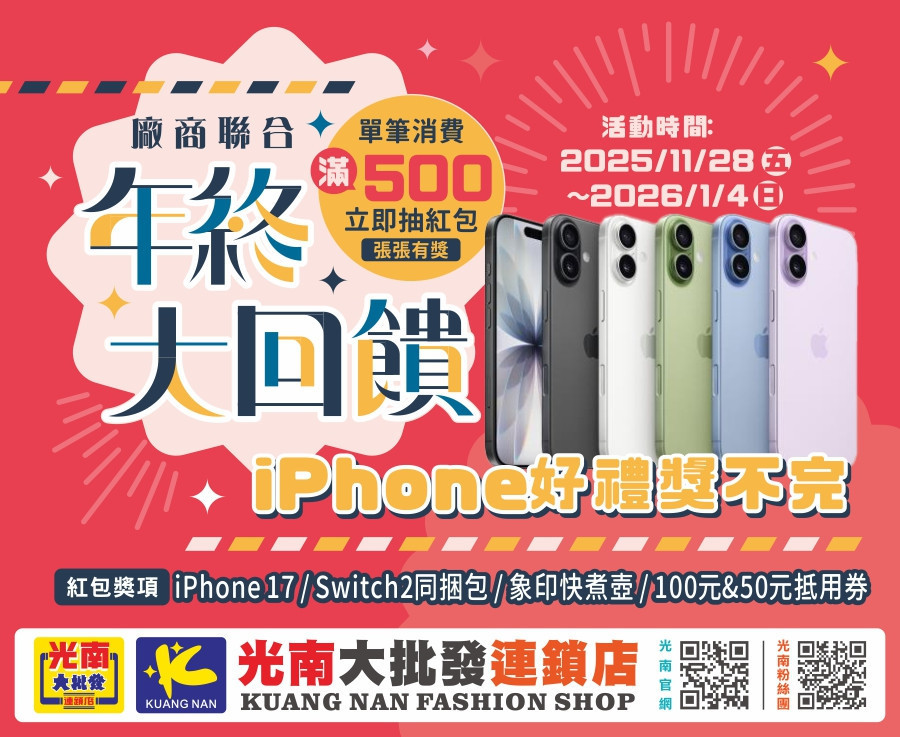 眾所期盼的光南大批發年終大回饋活動,將於2025年11月28日(五)-2026年1月4日(日),在全國30家門市同步舉辦。活動期間內,凡單筆消費滿額500元,立即抽紅包一個,單筆消費滿額1000元,立即抽紅包二個,依此類推.。紅包採通通有獎,獎項有︰◆ iPhone 17 256GB ◆ Switch 2 瑪利歐賽車世界主機組合 ◆ 象印日式雙層防燙快煮壺1.5L◆ 100元抵用券 ◆ 50元抵用券。