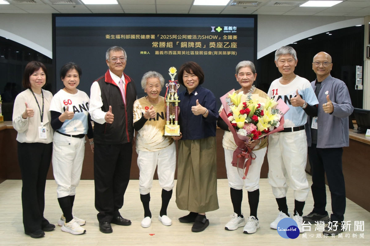 國民健康署10月15日在新北市板樹體育館舉辦「長者活躍老化競賽」全國總決賽,匯集各分區金銀隊伍同場競技。嘉義市由育英里辦公處「育英火雞隊」及鳶尾花人文促進協會兩支代表隊出賽,雙雙奪下常勝組及新秀組銅獎佳績。本(11)月26日兩支代表隊在市務會議時,與市府團隊分享獲獎榮耀,市長黃敏惠大讚參賽成員洋溢熱情,展現滿滿活力,現場氣氛溫馨。