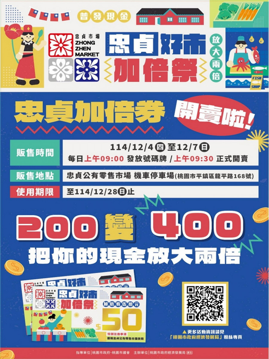 隨著普發新台幣一萬元現金陸續入帳,如何在物價通膨的壓力下,讓這筆「紅包」發揮最大效益,成為近期民眾熱議焦點。為搶攻歲末年終的民生消費商機,桃園市政府經濟發展局祭出強打攻勢,選定指標性的「忠貞公有零售市場」,推出「忠貞好市加倍祭」。12月4日至12月7日,民眾可以用200元的優惠價,換購價值400元的市場加倍券,讓您的現金加倍放大,可以採買更多商品。