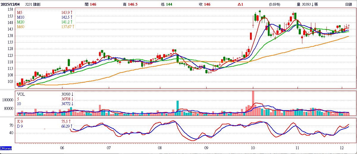 理周投研部指出,緯創10月營收為1851億元,為歷史第5高,累計今年前10個月營收為1.65兆元,年增94.6%,創歷史新高,且在GB300伺服器持續放量出貨,市場看好緯創11月營收可望再創新高。雖然4日遭市場三大法人連手調節賣超,但股價仍收漲1元,5日股價帶量走高,主要與法人年底積極作帳並回補水位有關。