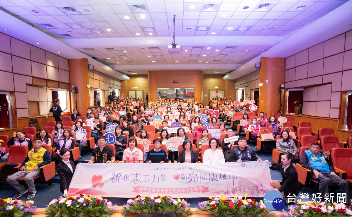 114年度新北市政府衛生局衛生保健績優志工暨團隊表揚典禮5日於衛生局大禮堂舉辦,由陳潤秋局長親自頒發1位特殊貢獻獎、79位永恆白金獎(服務年資滿10年、服務時數滿2,000小時),以及11隊志工運用單位評鑑優等及甲等獎,藉由表揚與大家共享志工榮耀。