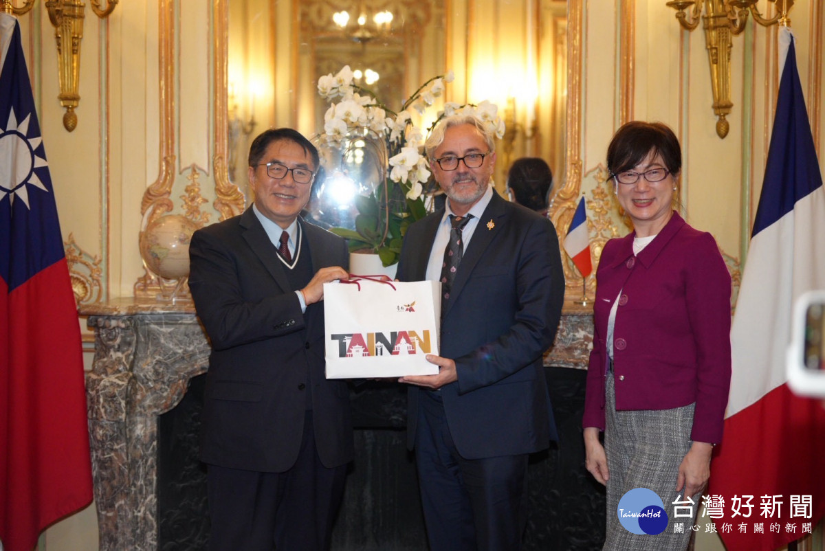 台南市長黃偉哲昨日造訪駐法國台北代表處,並在郝培芝大使的陪同下會晤法國國民議會友台小組副主席馬堤諾議員(Éric Martineau),三方就綠能政策、農業貿易、地方政治及國際情勢等議題進行深度會談。