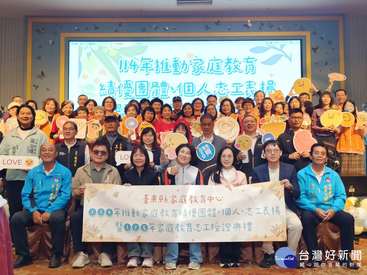 臺東縣家庭教育中心6日舉辦114年推動家庭教育績優團體、個人、志工表揚暨115年家庭教育志工授證典禮,場面熱鬧溫馨,縣長饒慶鈴頒獎表揚獲選教育部績優志工團隊獎的臺東縣家庭教育中心,感謝志工與夥伴長年投入,期許持續攜手強化社會安全網,為臺東每個家庭帶來更多支持力量。