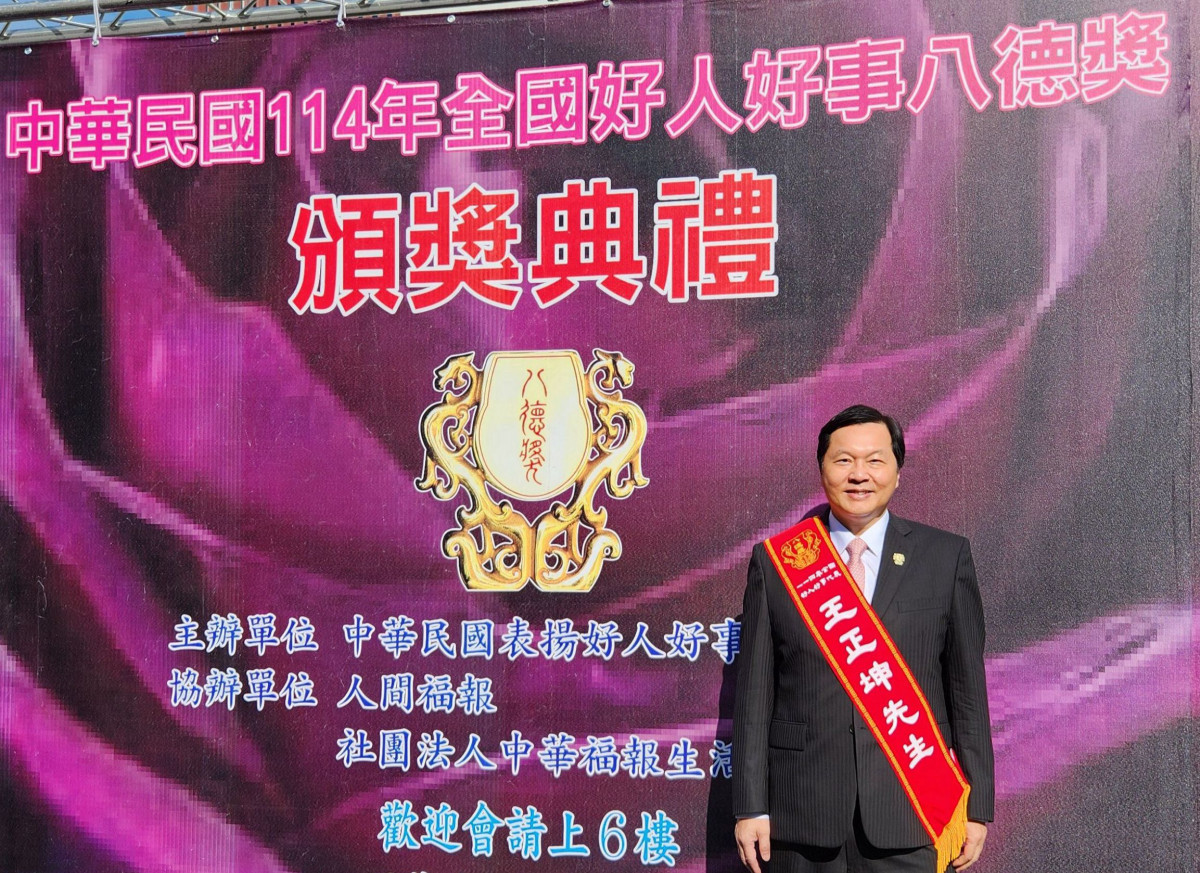 中華民國表揚好人好事運動協會主辦的114年全國好人好事代表「八德獎」頒獎典禮,12月10日在臺北市政府青年局舉行。王正坤醫師以長年深耕醫療公益、扶助弱勢及回饋教育的卓越事蹟,榮獲「八德獎」殊榮,成為全國醫界與企業界兼具的典範代表。